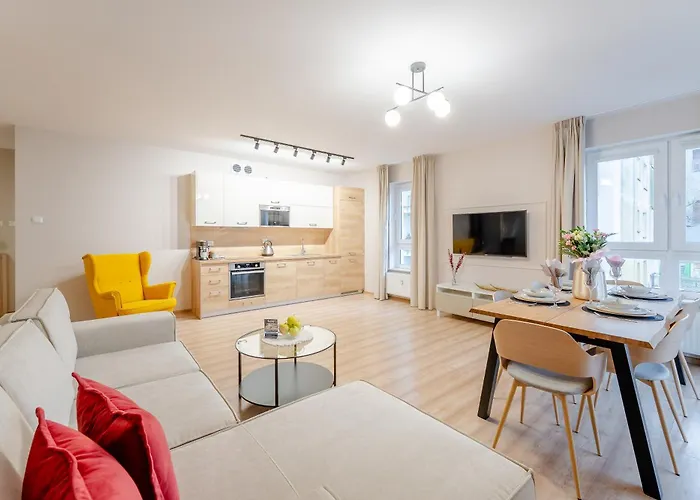 El Stefan Żeromski Park se sitúa a tan solo 1 km de este apartamento de 77 m², mientras que la Playa Central está no muy lejos de la propiedad. El apartamento también se encuentra a poco más de 10 minutos a pie del Acuario Oceanarium. El Museo de Armas Polacas está cerca de este establecimiento.